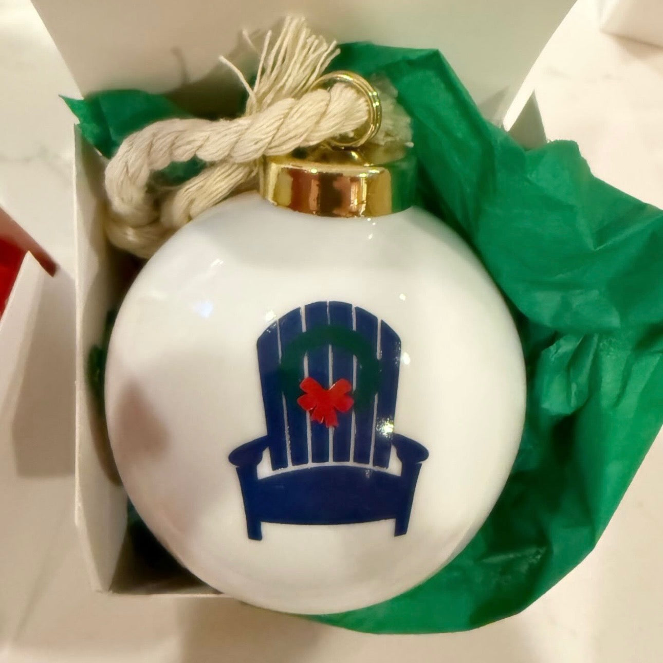 Perfect for your nautical tree or as a gift for that sea-loving friend, this Chair with Wreath Ornament will look great on any tree. Ceramic ornament with rope tie.
