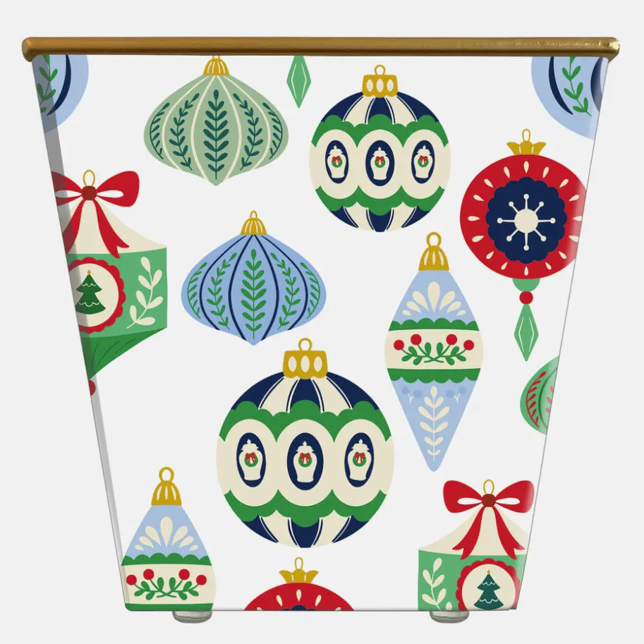 A perfect holiday gift, this Mini Ornaments Cachepot Candle is hand-poured, individually decorated and unscented. Each candle is wicked in cotton and contains the perfect blend of paraffin and vegetable waxes, providing approximately 40 hours of burn time. Handcrafted of composite material, wrapped in decorative paper, and finished with a burnished gold rim. Four protective pads support its base. Once the candle is gone, reuse the beautiful container to hold plants or flowers, or as a decorative object.
