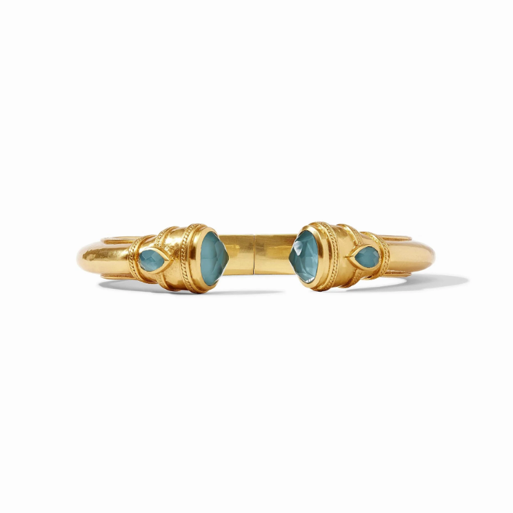 Featuring gemstone endcaps and two more pear-shaped gemstones set in a luxuriously gilded shank, this Julie Vos Cannes Demi Cuff in Peacock Blue and Gold is a sumptuous cuff. Generous enough to wear alone or stack with other Julie Voss bracelets for a heavier look. Made of 24K gold plate and iridescent chalcedony blue gemstones. The regular size is 2 1/2" in diameter.