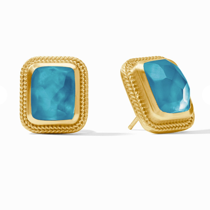 Classic rectangular shape with a braid surrounding the stone, these Cheval Stone Studs in Iridescent London Blue by Julie Vos are made of 24K gold plate. With a post for pierced ears, they include 24K gold plated earring backs.