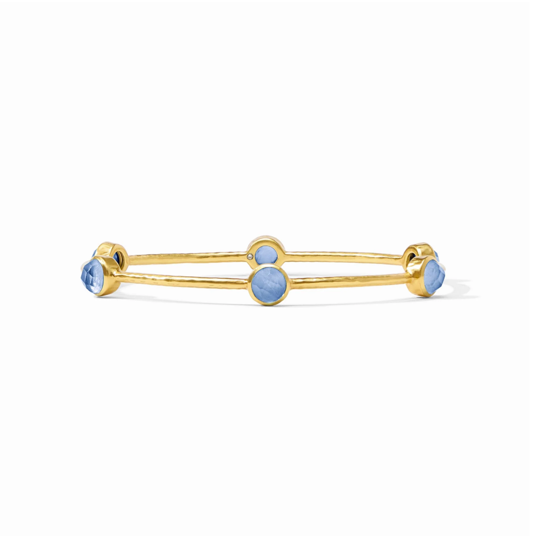 The Julie Vos Milano Luxe Bangle in Iridescent Chalcedony Blue is a lightly hammered bangle embellished with six iridescent gemstones. Made of 24K gold plate and imported glass.