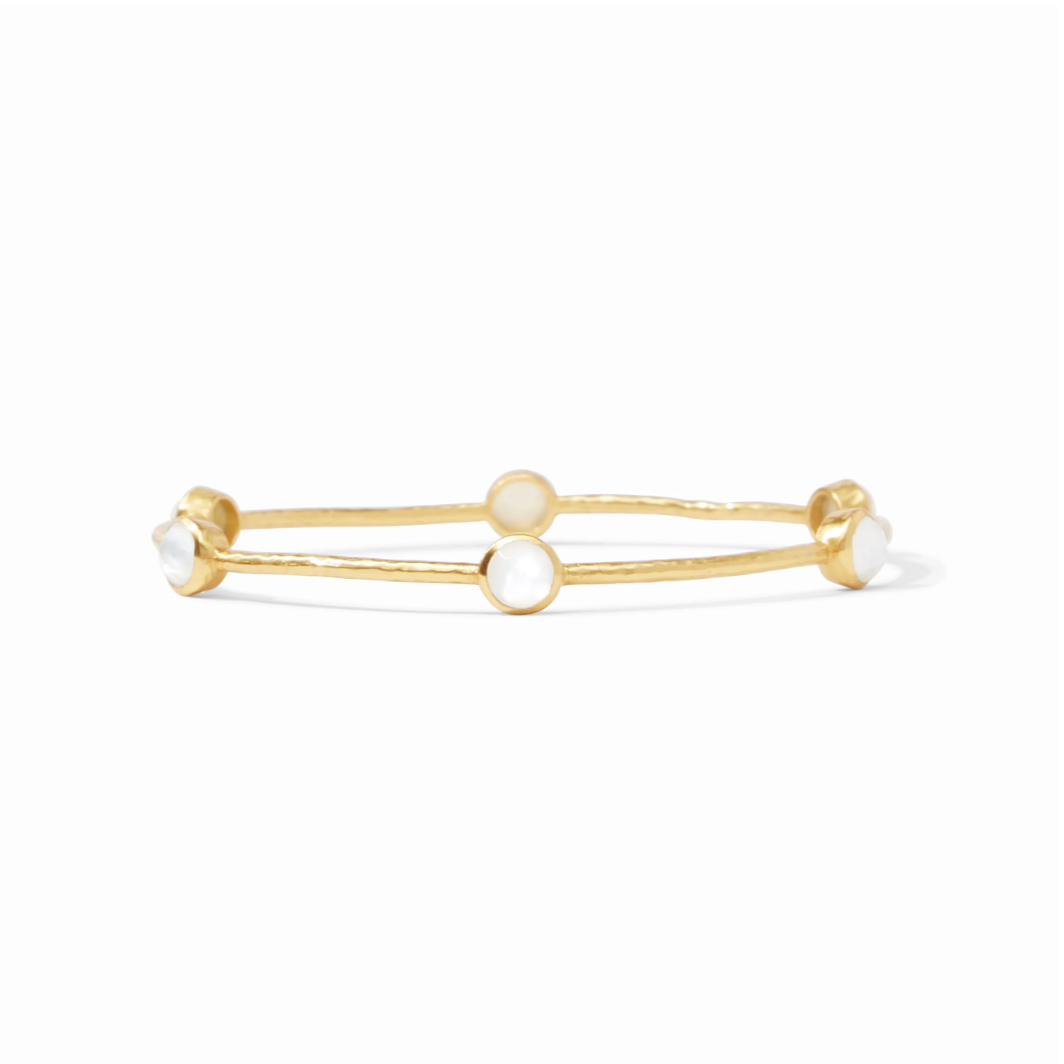 The Julie Vos Milano Luxe Bangle in Iridescent Clear Crystal is a lightly hammered bangle embellished with six iridescent gemstones. Made of 24K gold plate and imported glass.