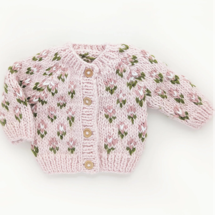 The Bitty Blooms Blush Cardigan will transform any child's wardrobe. Featuring elegant rosy pink flowers and moss green leaves, the sweater is hand knit of a cozy, thick knit yarn, that is60% acrylic, 40% recycled polyester. The recycled polyester is a sustainable yarn made from plastic bottles. Hand wash. A matching knit has is available separately. Available in 0-6 month and 6-12 month sizes.