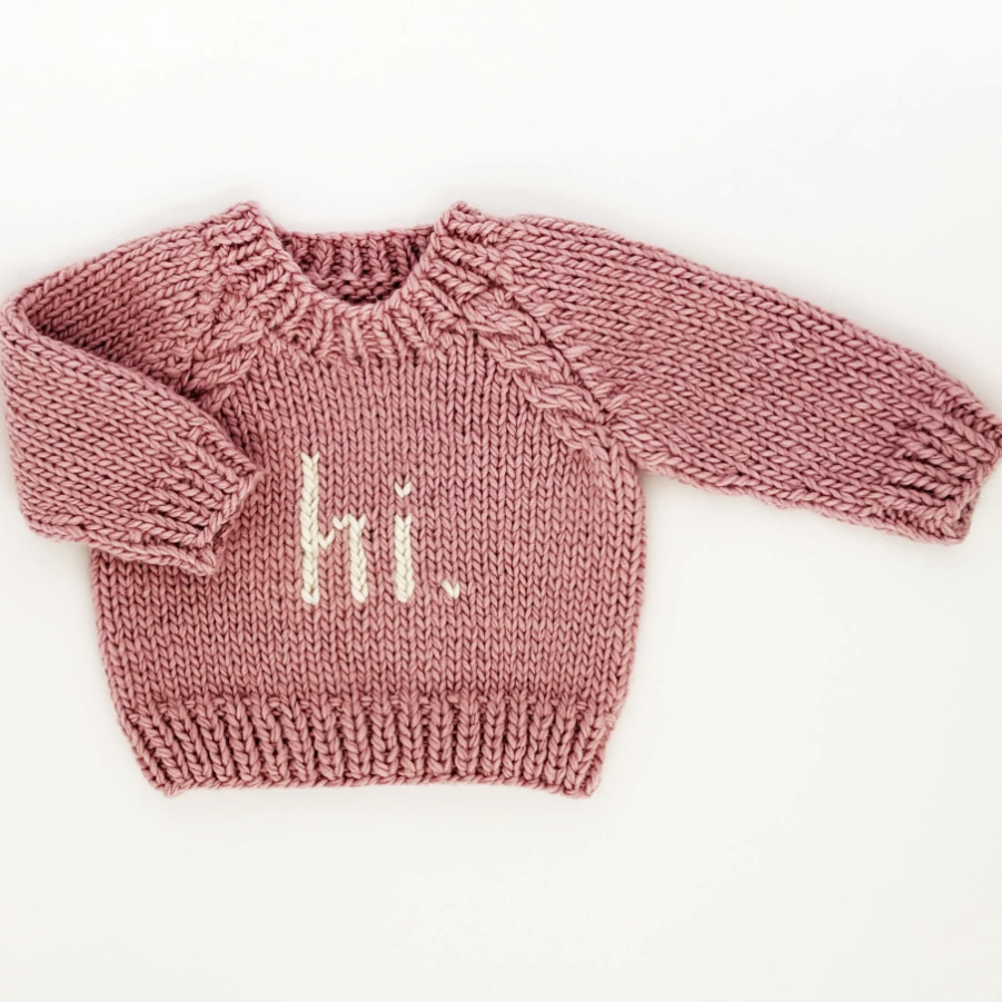 Brighten the day with a cheerful hello! Featuring charming cable-trimmed raglan sleeves and a playful "hi" this sweater is knit in natural and the base a rosy color. With a gently knit neckline to make it easy to slip over little heads, it is hand-knit with a chunky yarn ensuring softness and warmth. Any baby girl will bring smiles wearing this delightful sweater. Made from 60% acrylic and 40% recycled polyester. The recycled, sustainable polyester portion is made from plastic bottles. Hand wash. Available in 0-6 month and 6-12 month sizes.