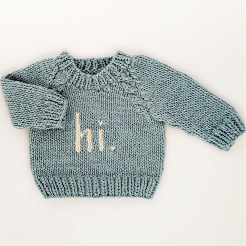 Brighten the day with a cheerful hello! Featuring charming cable-trimmed raglan sleeves and a playful "hi" this sweater is knit in natural and the base a rosy color. With a gently knit neckline to make it easy to slip over little heads, it is hand-knit with a chunky yarn ensuring softness and warmth. Any baby girl will bring smiles wearing this delightful sweater. Made from 60% acrylic and 40% recycled polyester. The recycled, sustainable polyester portion is made from plastic bottles. Hand wash. Available in 0-6 month and 6-12 month sizes.