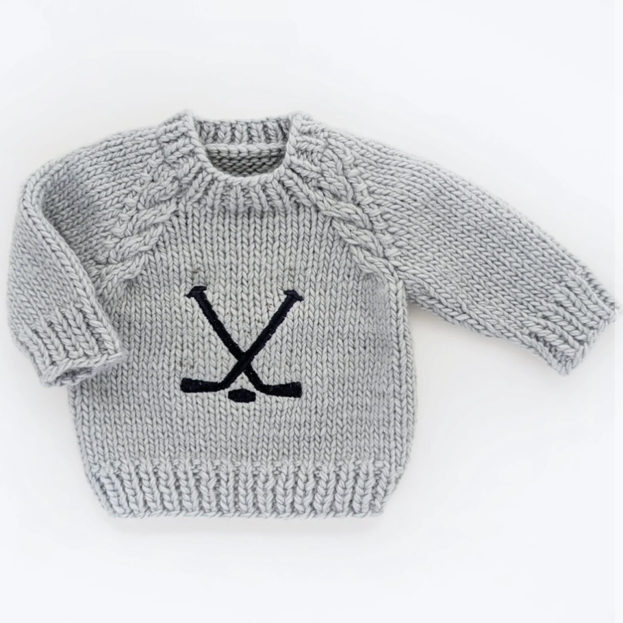 With an ice grey background yarn and embroidered navy blue hockey sticks and a puck, this Hockey Sweater is a must-have for any hockey fan. Hand knit of cozy 60% acrylic and 40% recycled polyester yarn, the sustainable polyester portion is made from plastic bottles. Hand wash. The matching beanie hat is available separately. Available in 0-6 month and 6-12 month sizes.