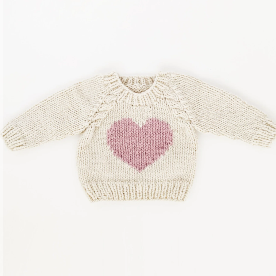 Hand knit in chunky yarn, this soft and warm Sweetheart Crewneck Sweater has a natural background with a rosy pink heart in the front. Made of 60% acrylic and 40% recycled polyester yarn. The sustainable polyester portion is from recycled plastic bottles. A great girl's sweater and makes an adorable Valentine's Day gift. Hand wash. A matching Sweetheart Beanie Hat is available separately. Available in 0-6 month and 6-12 month sizes.