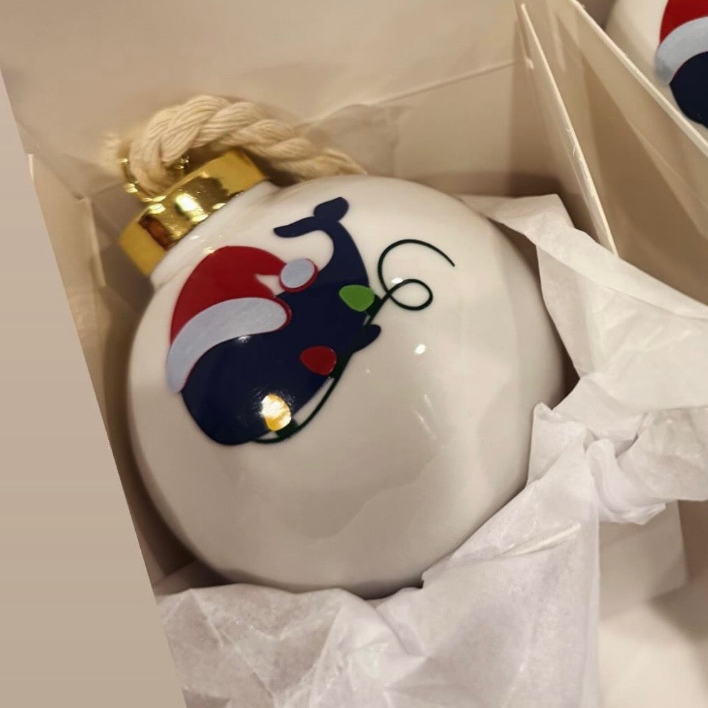 For a fun, whimsical, nautical touch on your tree or gift the sea-loving loved one on your list, this Santa Whale with String Lights Ornament will be perfect. Ceramic ornament with rope tie.