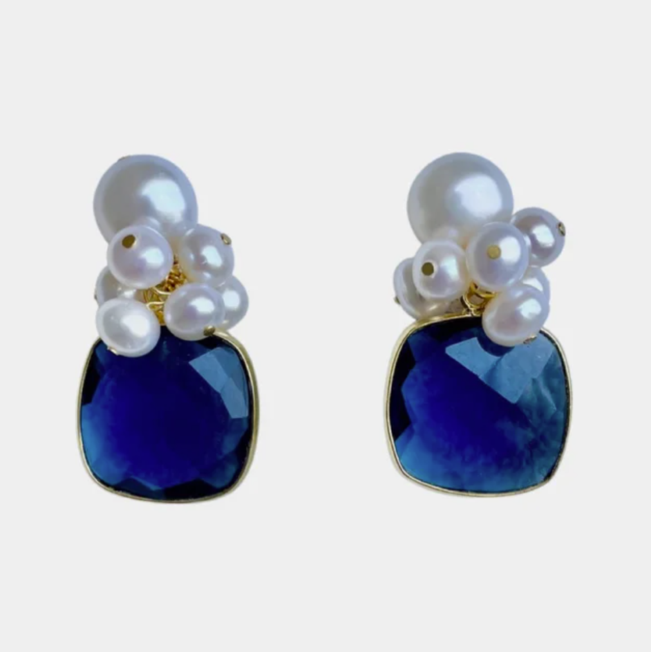 Love blue, these are for you! Lightweight and gorgeous, these Reese Earrings in Sapphire Blue have a freshwater pearl earring post with freshwater pearl cascades and a cushion cut gemstone bezel.